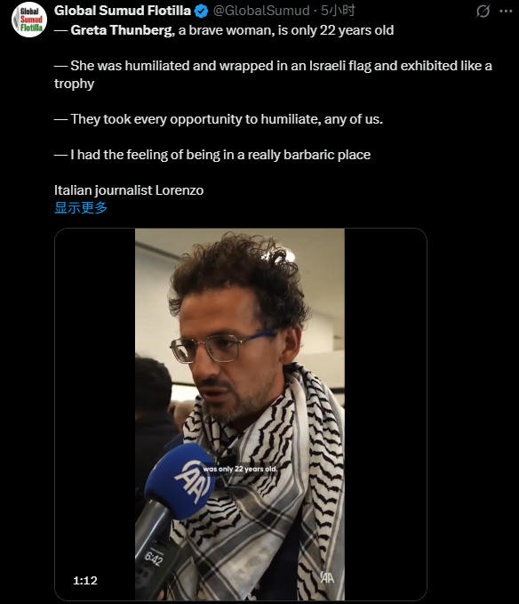 数日前,国际加沙援助船队超450名成员遭以色列军队逮捕、扣押,迄今只有不到三分之一获释,其中不包括瑞典“环保少女”通贝里。